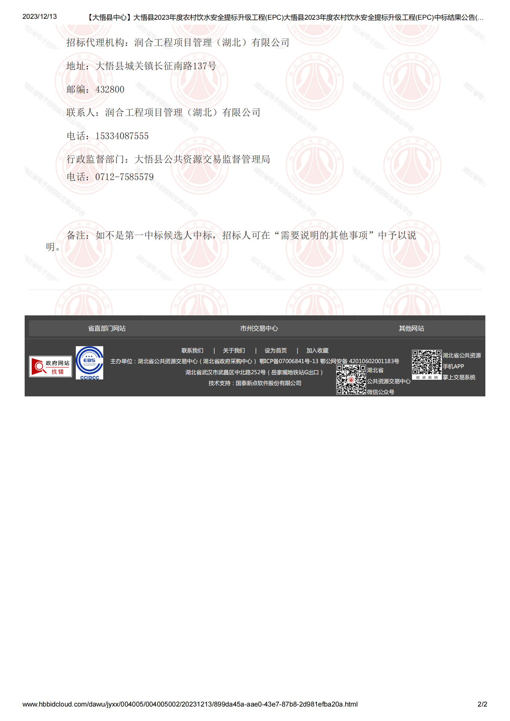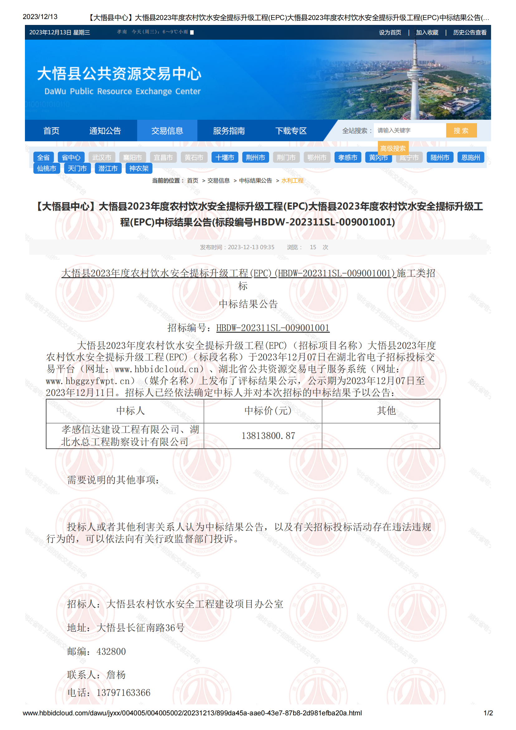 項目名稱:大悟縣2023年度農村飲水安全提標升級工程(EPC)